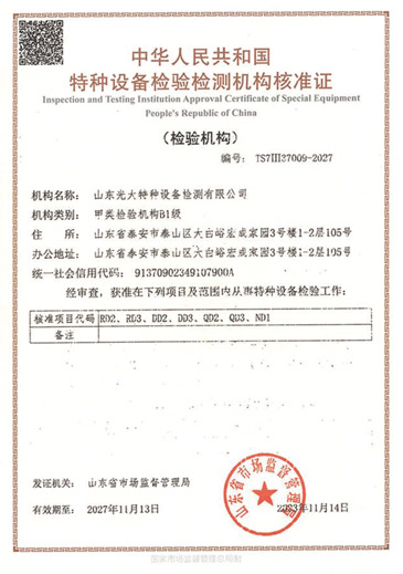 山東光大特種設備檢測有限公司是經(jīng)山東省市場監(jiān)督管理局核準的甲類B1特種設備綜合檢驗機構。2017年9月30日取得了山東省市場監(jiān)督管理局頒發(fā)的《檢驗檢測機構資質認定證書》。2018年2月22日取得了山東省市場監(jiān)督管理局頒發(fā)的《特種設備檢驗檢測機構核準證》(起重機械)檢驗檢測資質。2021年11月取得山東省市場監(jiān)督管理局版發(fā)的《特種設備檢驗檢測機構核準證》(安全閥在線、離線)校驗資質。2023年11月取得山東省市場監(jiān)督管理局頒發(fā)的甲類檢驗機構B1《特種設備檢驗檢測機構核準證》,具有壓力容器(RD2...